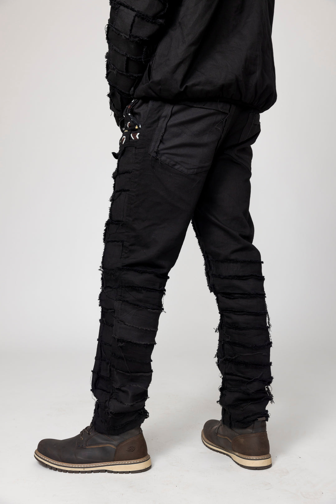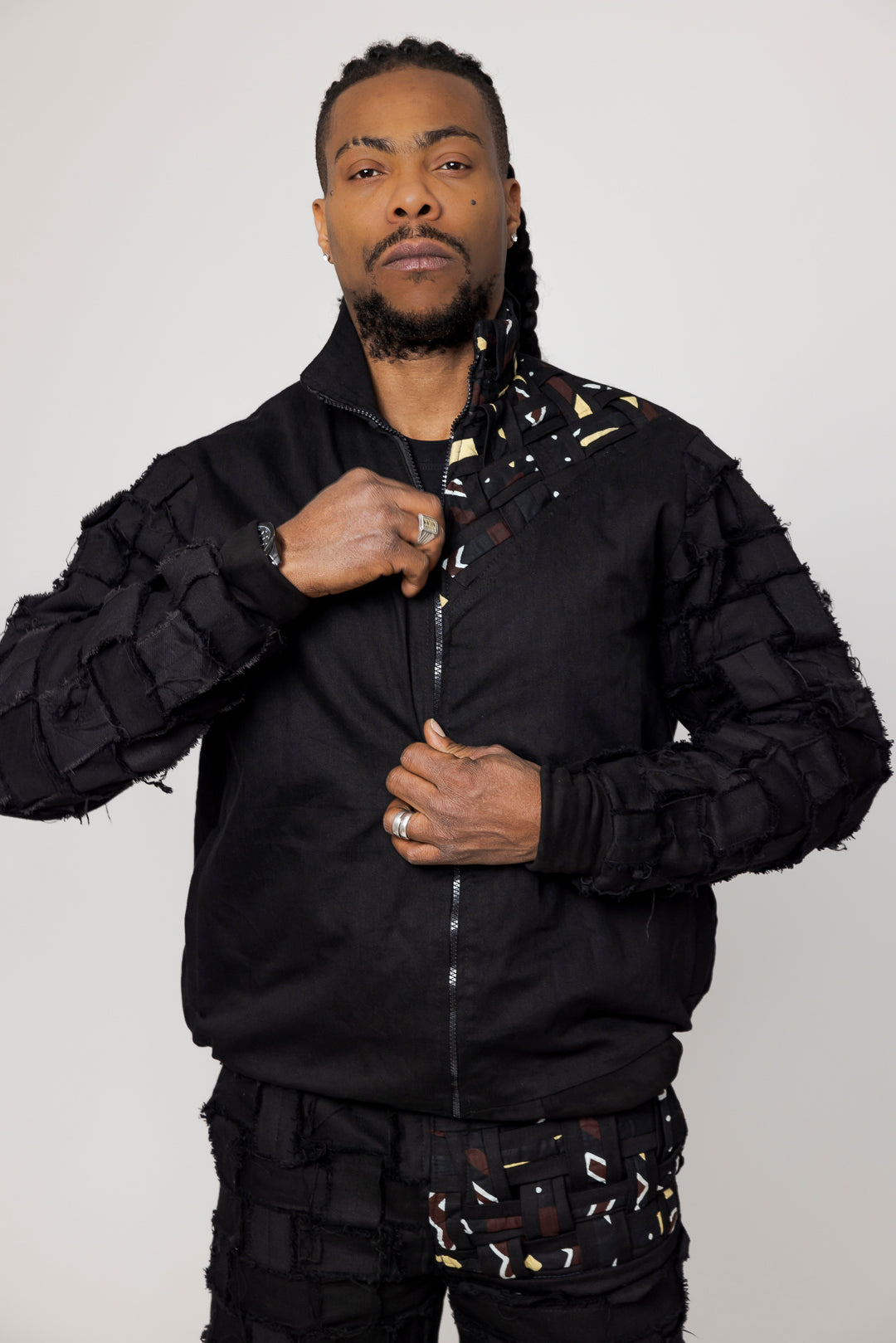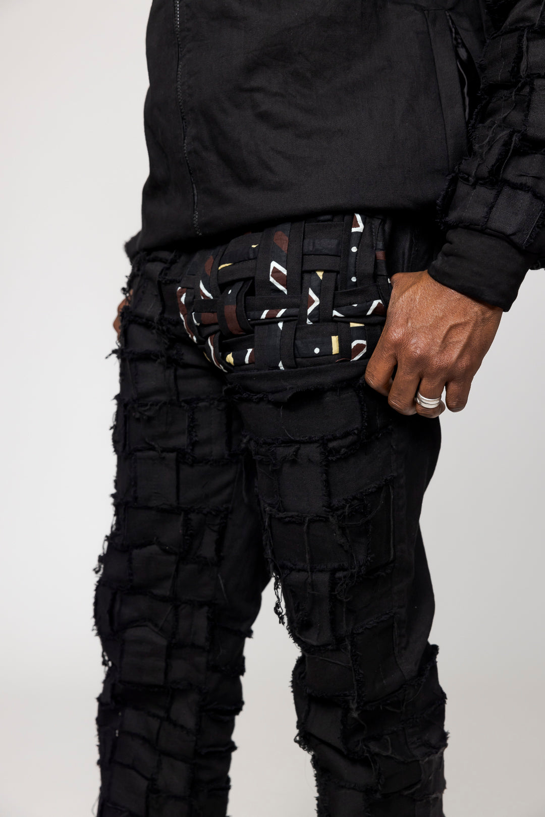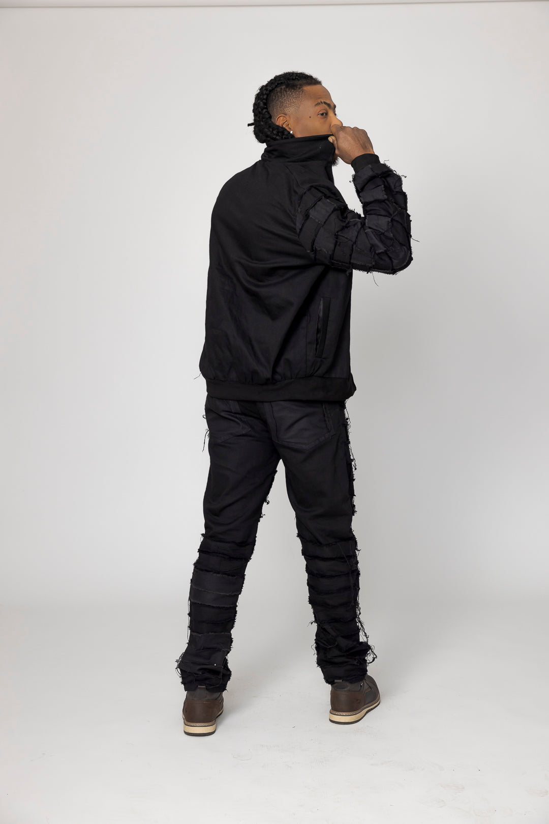 Denim-Anzug "AiMi" mit Jacke und Hose. An der Seite des Kragens und an der Hose mit dezenten Farbdetails verziert.