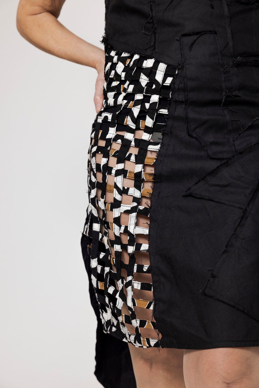 Modisches Denim-Kleid mit seitlicher Definition durch afrikanischen Stoff "Florry". Sportlich und elegant zugleich.