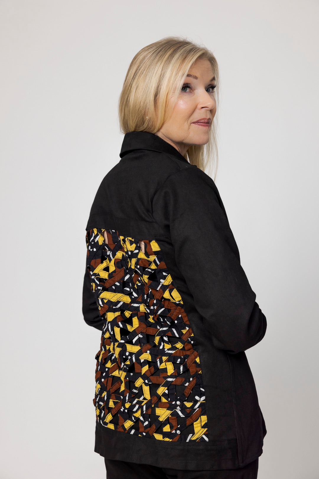 Jeans-Blazer "Fayu" mit langen Ärmeln und Kragen, kombiniert mit afrikanischem Muster auf der Rückseite. Elegant geschnitten und betont die Figur.