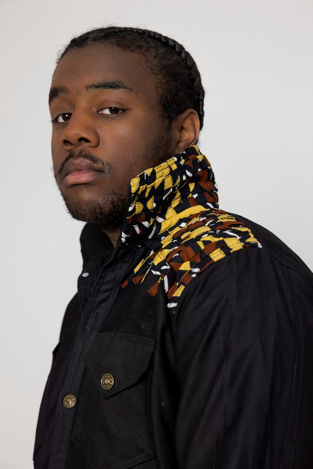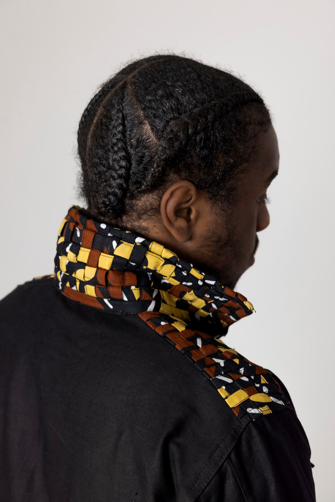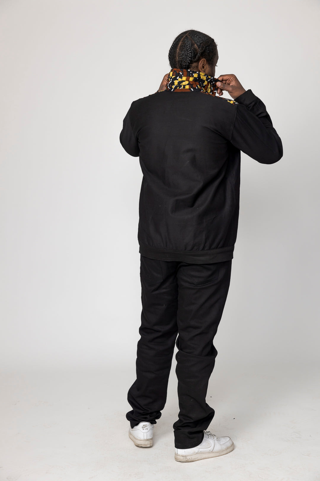 Jeansjacke "Raje" mit farbenfrohen Applikationen am Kragen, kombiniert mit passender Jeanshose.