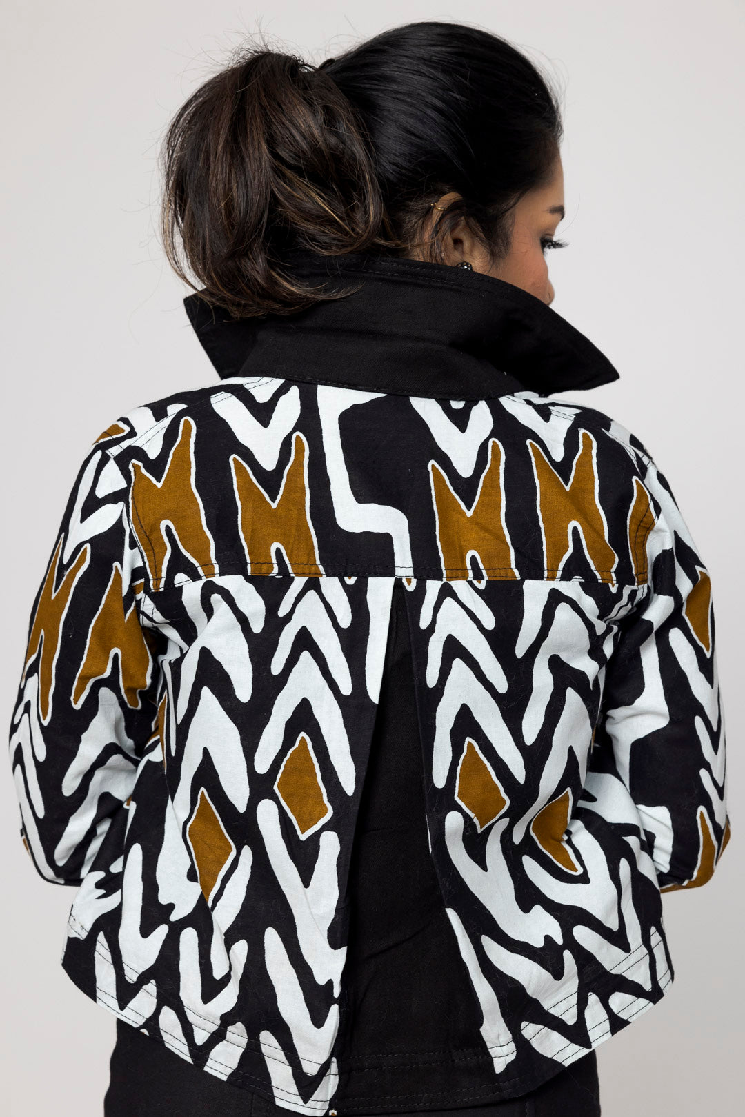 Figurbetontes Kleid "Elly" ohne Ärmel, kombiniert mit einem passenden Blazer. Der Blazer verfügt über einen Kragen, der vorne mit afrikanischem Stoff detailliert ist, und dazu gibt es eine Jacke.