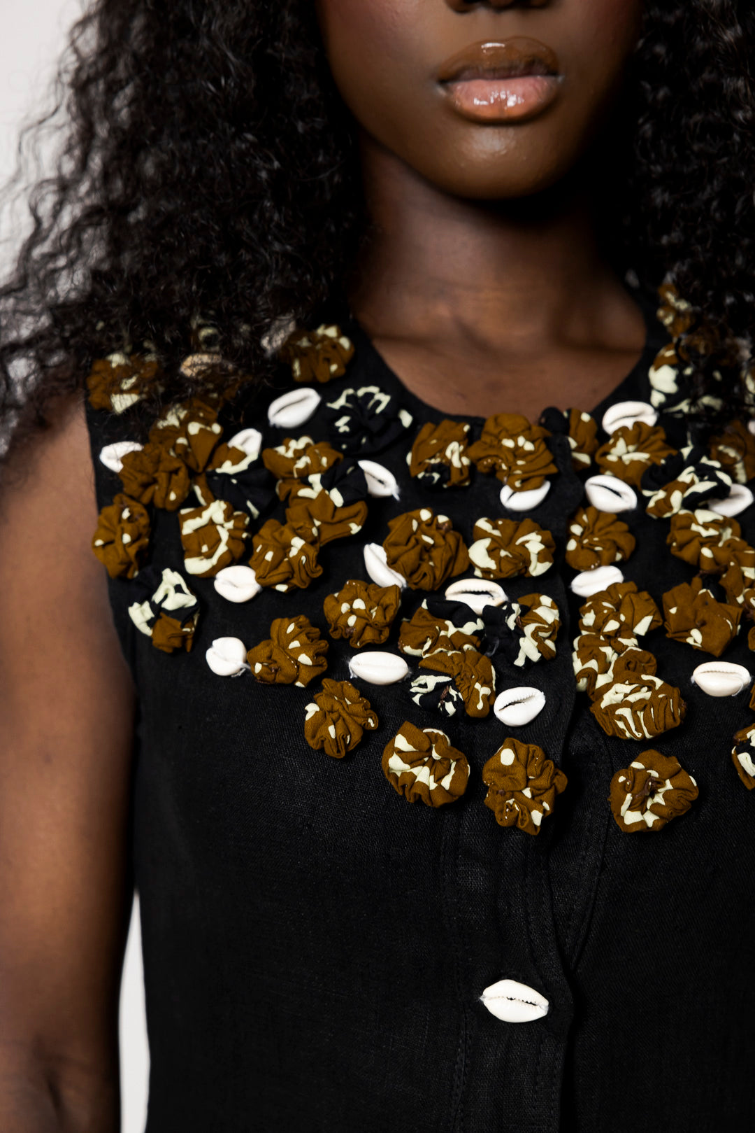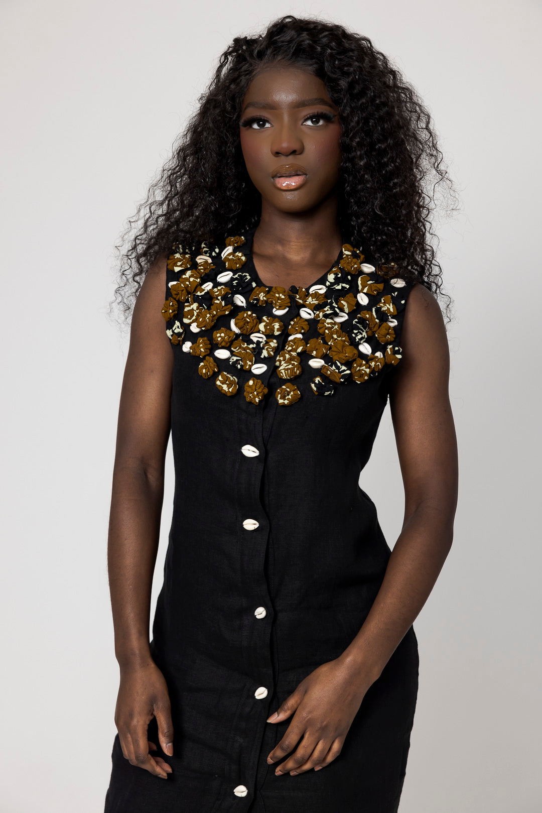 Fashionable sleeveless linen dress with handmade drapery from West African fabric. A showstopper!