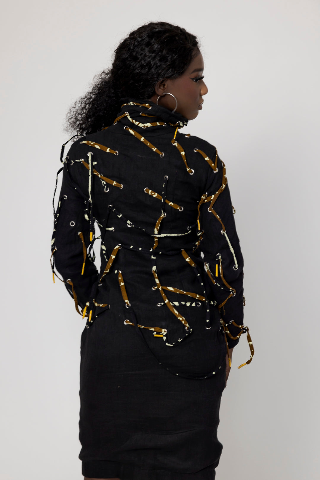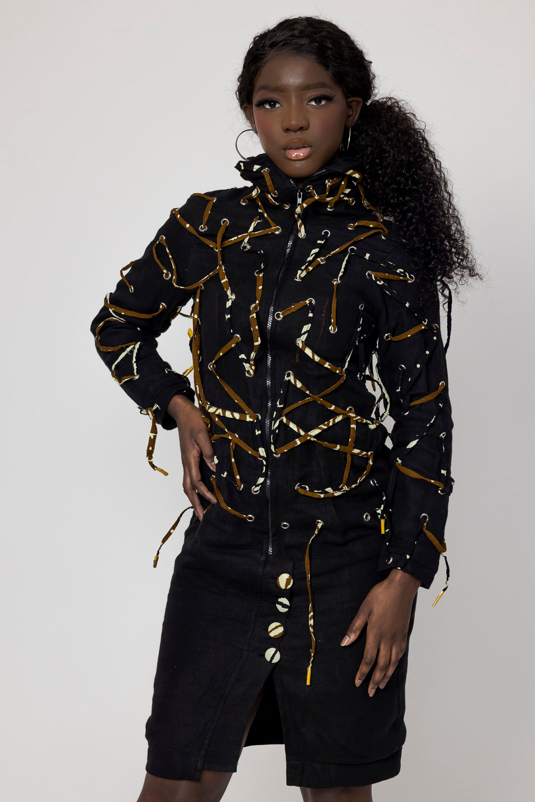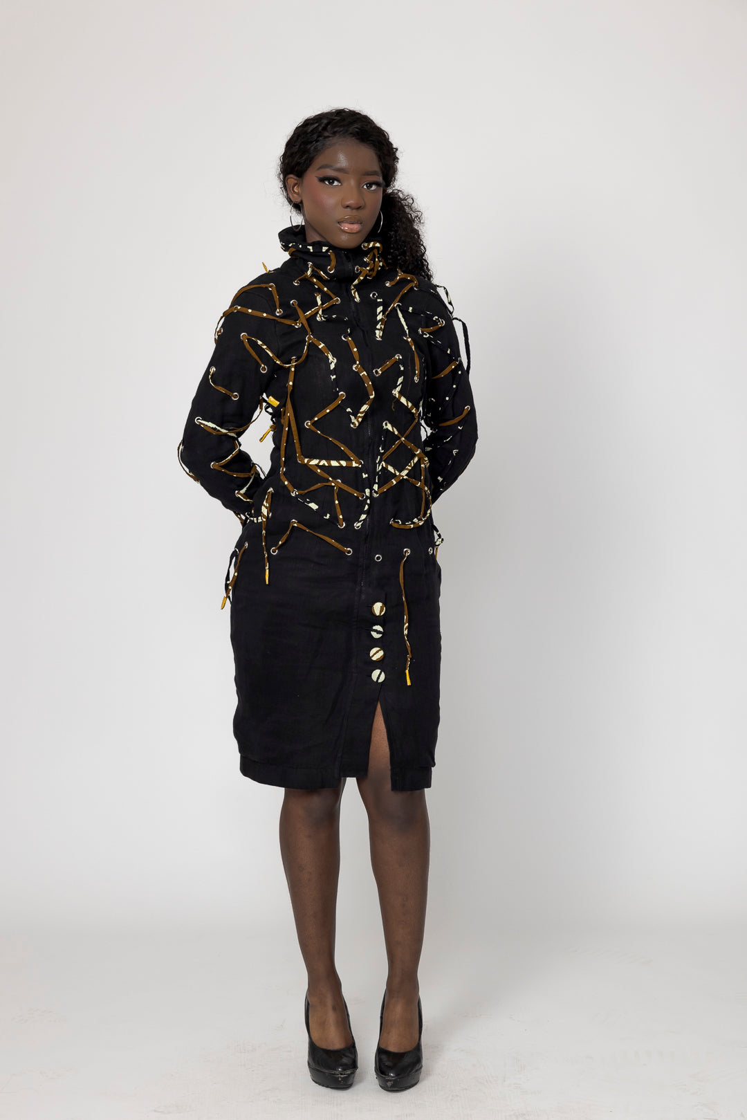 Mantel aus Leinen "Lenny" mit hohem Kragen, knielang, feminin und für jedes Wetter geeignet. Durchgezogene Kordel mit farbigem afrikanischem Stoff.