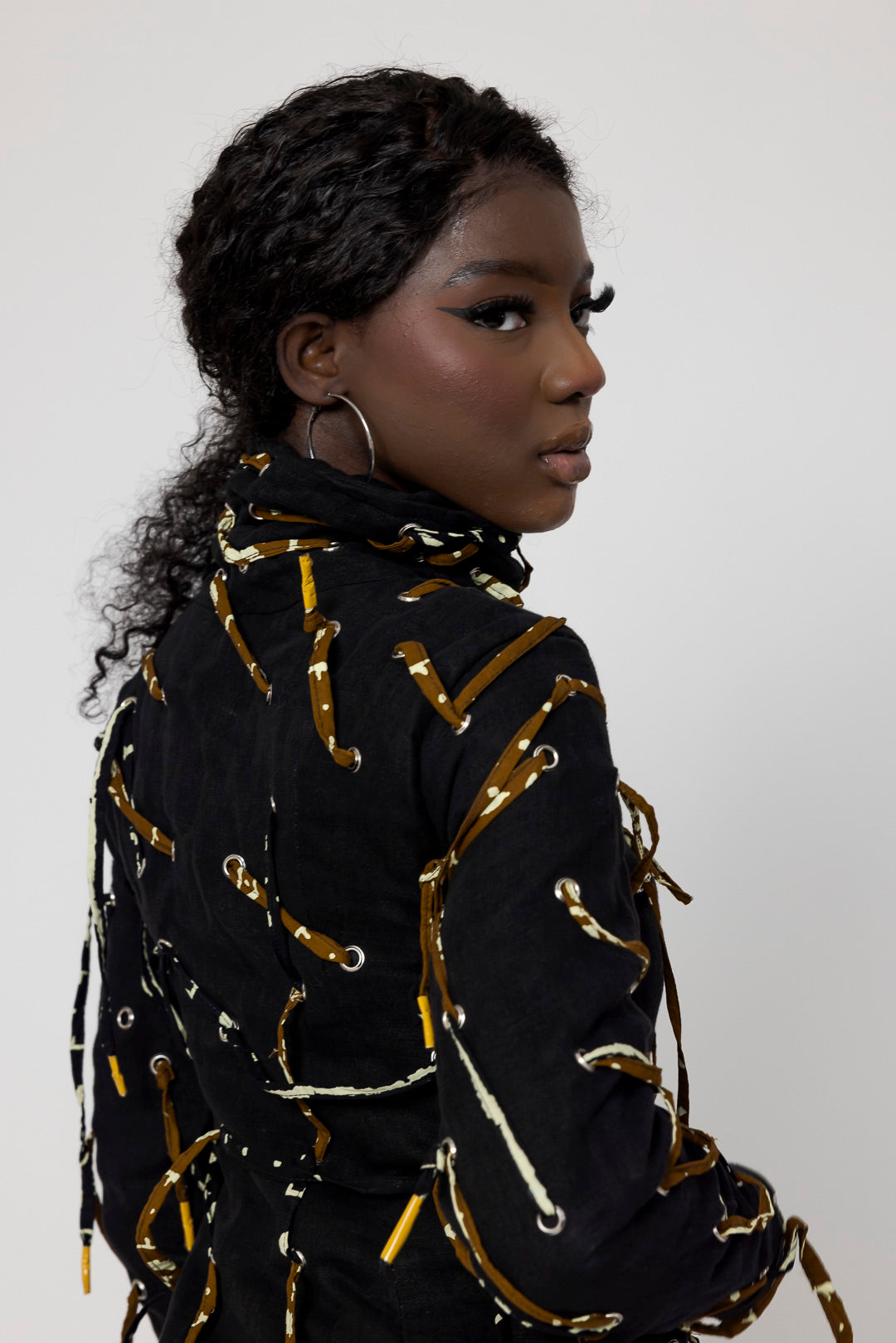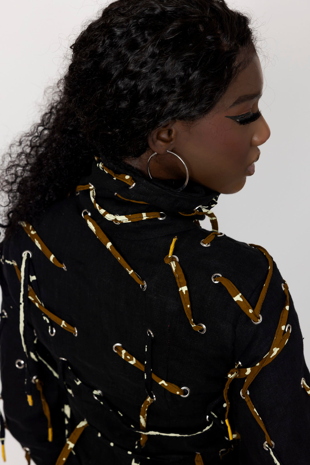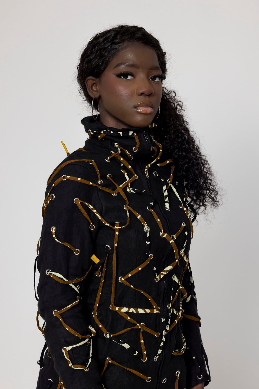Mantel aus Leinen "Lenny" mit hohem Kragen, knielang, feminin und für jedes Wetter geeignet. Durchgezogene Kordel mit farbigem afrikanischem Stoff.