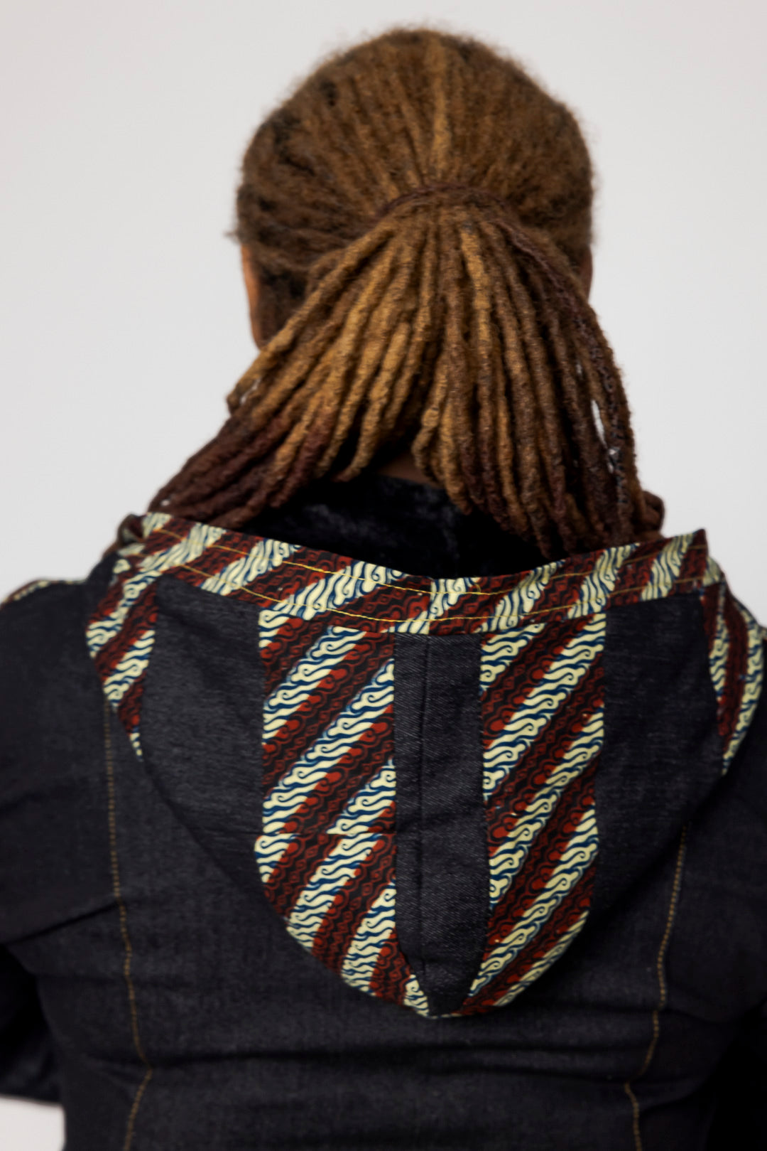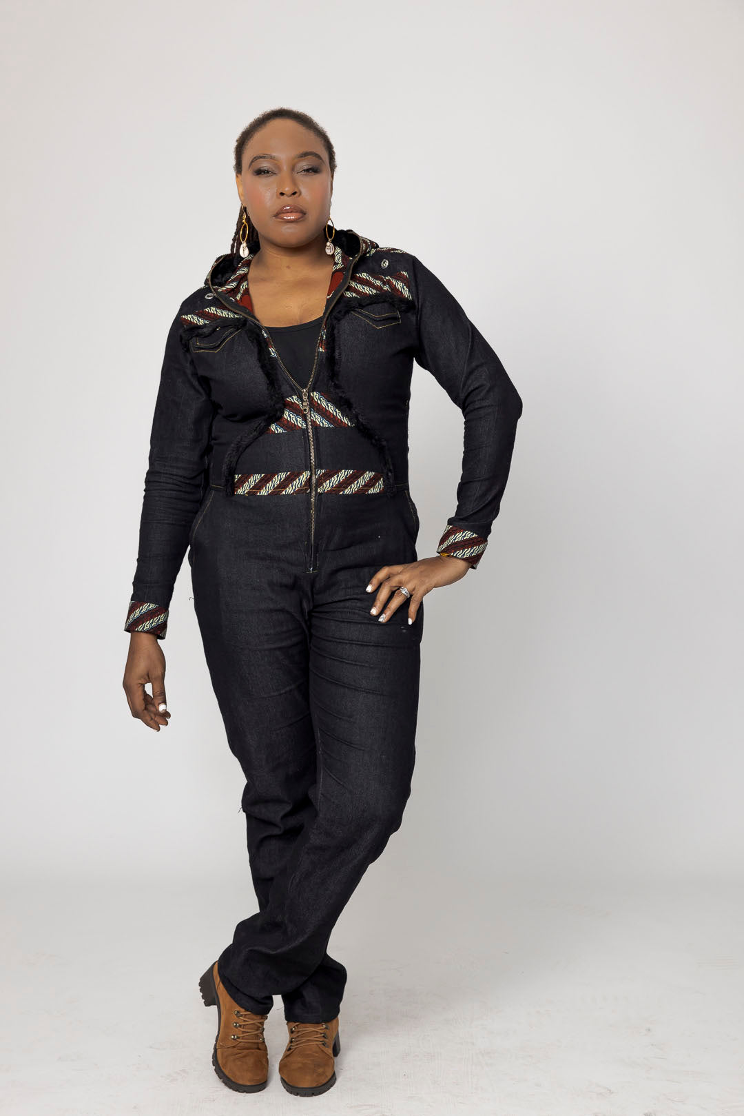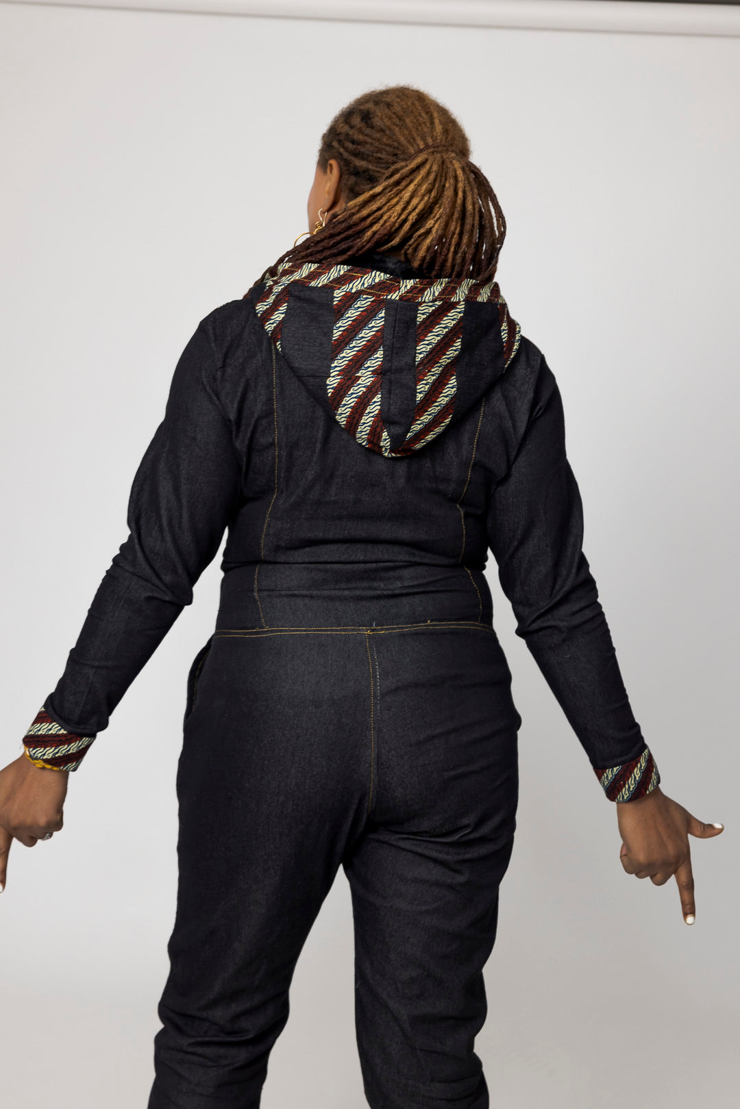 Klassischer Overall "Ogena" aus Denim mit einem Design aus afrikanischem Stoff und einer Kapuze.