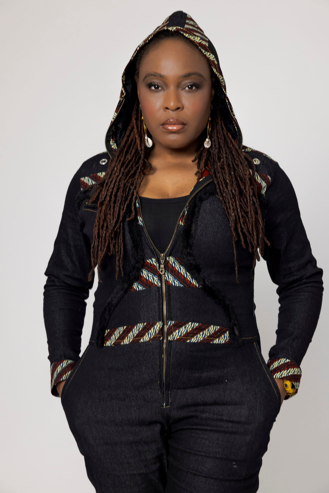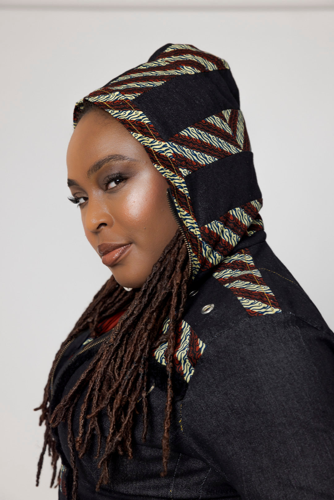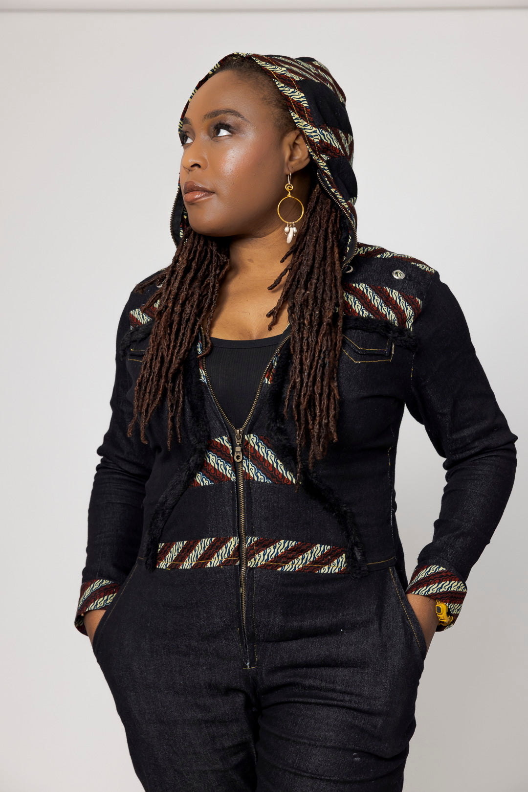 Klassischer Overall "Ogena" aus Denim mit einem Design aus afrikanischem Stoff und einer Kapuze.